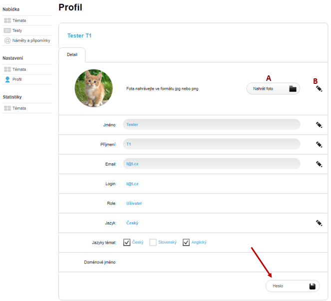 V části Profil si kromě jména, příjmení či e-mailu, můžete nahrát i fotografii přes tlačítko Nahrát foto s ikonkou složky v pravém horním rohu profilového okna (A). Do aplikace je možné nahrát pouze soubory s příponou .jpg či .png. Jakmile je požadovaná fotografie nahrána, může být nastaven ořez, tedy část fotky, která bude použita. Toto nastavení je možné přes ikonku tužky v pravém horním rohu profilového okna (B).