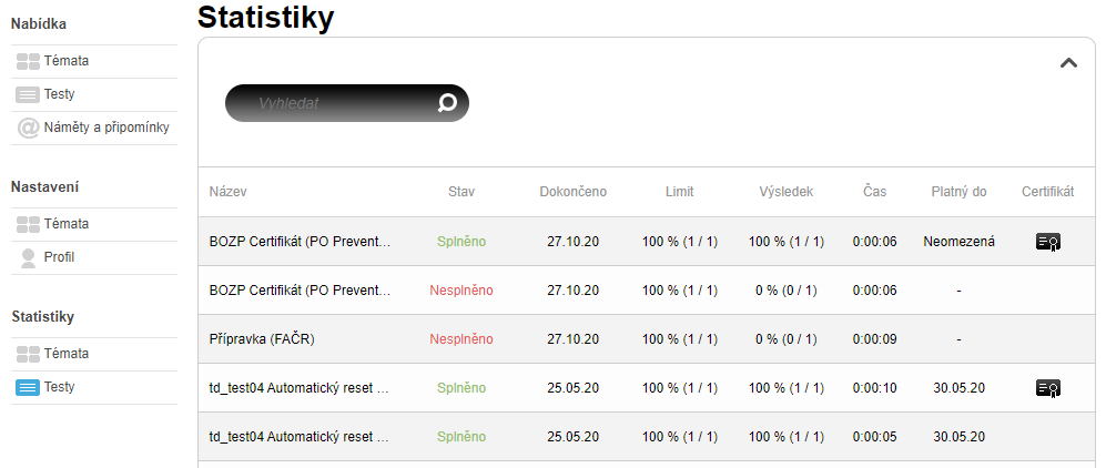 U každého testu je uvedeno, zda byl Splněn či Nesplněn, je uvedeno, do kdy je Platnotný a pokud je testu přiřazen Certifikát, v posledním sloupci přehledu je zobrazena ikonka certifikátu. Kliknutím na tuto ikonku si certifikát stáhnete k sobě do počítače.