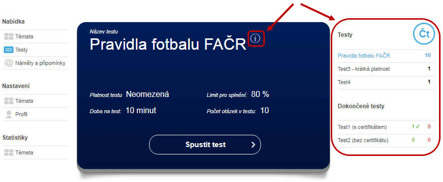 Vyberete-li konkrétní test z nabídky po pravé straně, v prostoru uprostřed obrazovky se vám zobrazí základní informace o testu – název testu, platnost testu, časový limit na test, požadavky pro splnění testu a celkový počet otázek. Detailnější popis k testu si zobrazíte přes (i) v kroužku, které se nachází hned za jménem testu (pokud je u daného testu k dispozici).
