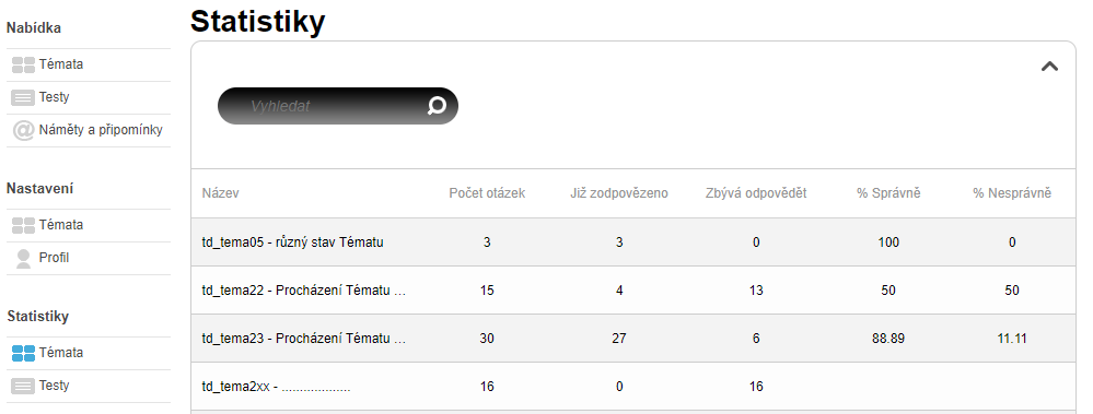 - V sekci Statistiky si může uživatel zobrazovat souhrnně statistiku úspěšnosti se studiem nabízených témat či přiřazených testů.